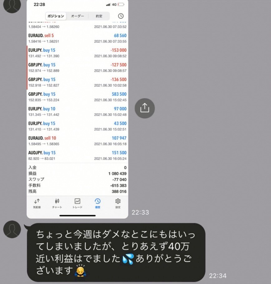 「内容はシンプルで理解しやすいですが、結局は続けて練習しないと結果は出ないと思いました。FXなので当然リスクもあると感じました。」
